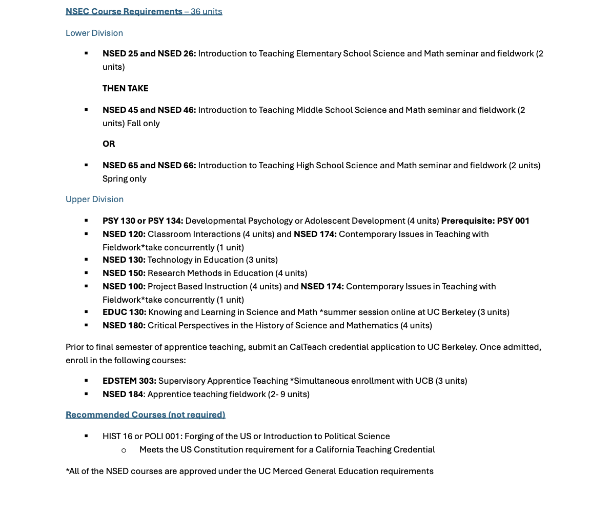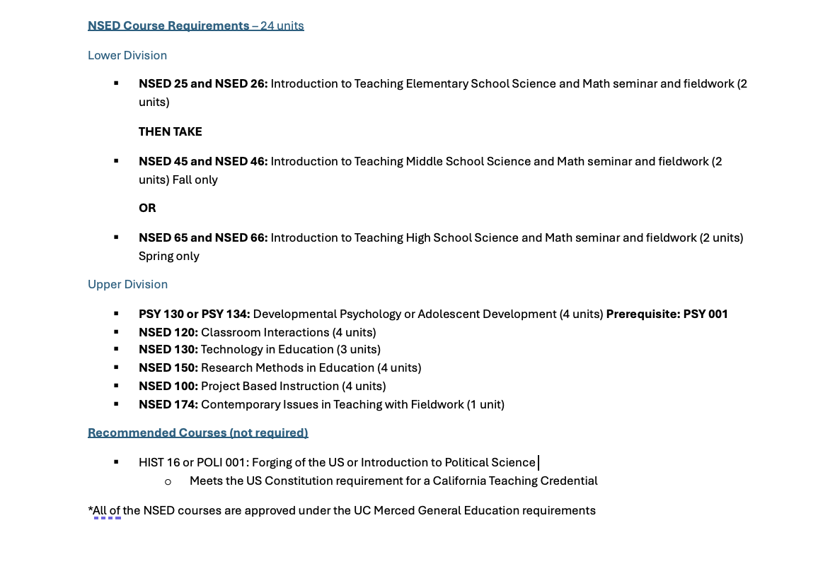 The NSED minor allows students to complete courses at UC Merced to introduce students to the classroom and develop skills used to run a classroom efficiently. This will give help students gain experience and prepare them to excel through a teaching credential program.